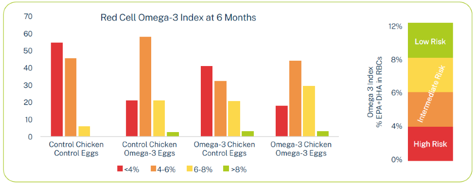 Regular consumption of Omega-3 PUFA enriched chicken meat and eggs provided 120mg/day of EPA and DHA (45% of daily recommended intake). This resulted in significant increases in red blood cell (RBC) levels of Omega-3 PUFAs, and a substantial shift in the distribution of the Omega-3 index in this healthy Irish population – numbers of subjects with a very high-risk Omega-3 index (index<4%) were more than halved amongst those that ate both enriched foods (see below figure). Furthermore, eating the enriched foods resulted in clinically relevant reductions in diastolic blood pressure and heart rate.