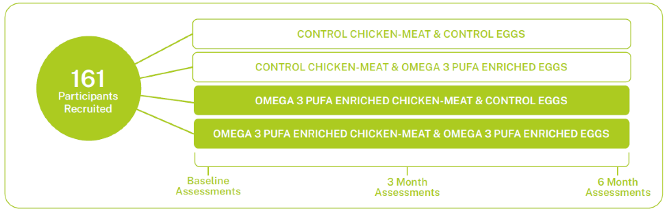 Led by Professor Alice Stanton, Professor of Cardiovascular Therapeutics at the Royal College of Surgeons in Ireland, and Director of Human Health at Devenish, a double blind randomized controlled clinical trial was conducted between 2015 and 2018 to study the impact of eating chicken meat and eggs naturally enriched with algae sourced Omega-3 PUFAs. The study was conducted over 6 months with 161 healthy participants randomized to eat: